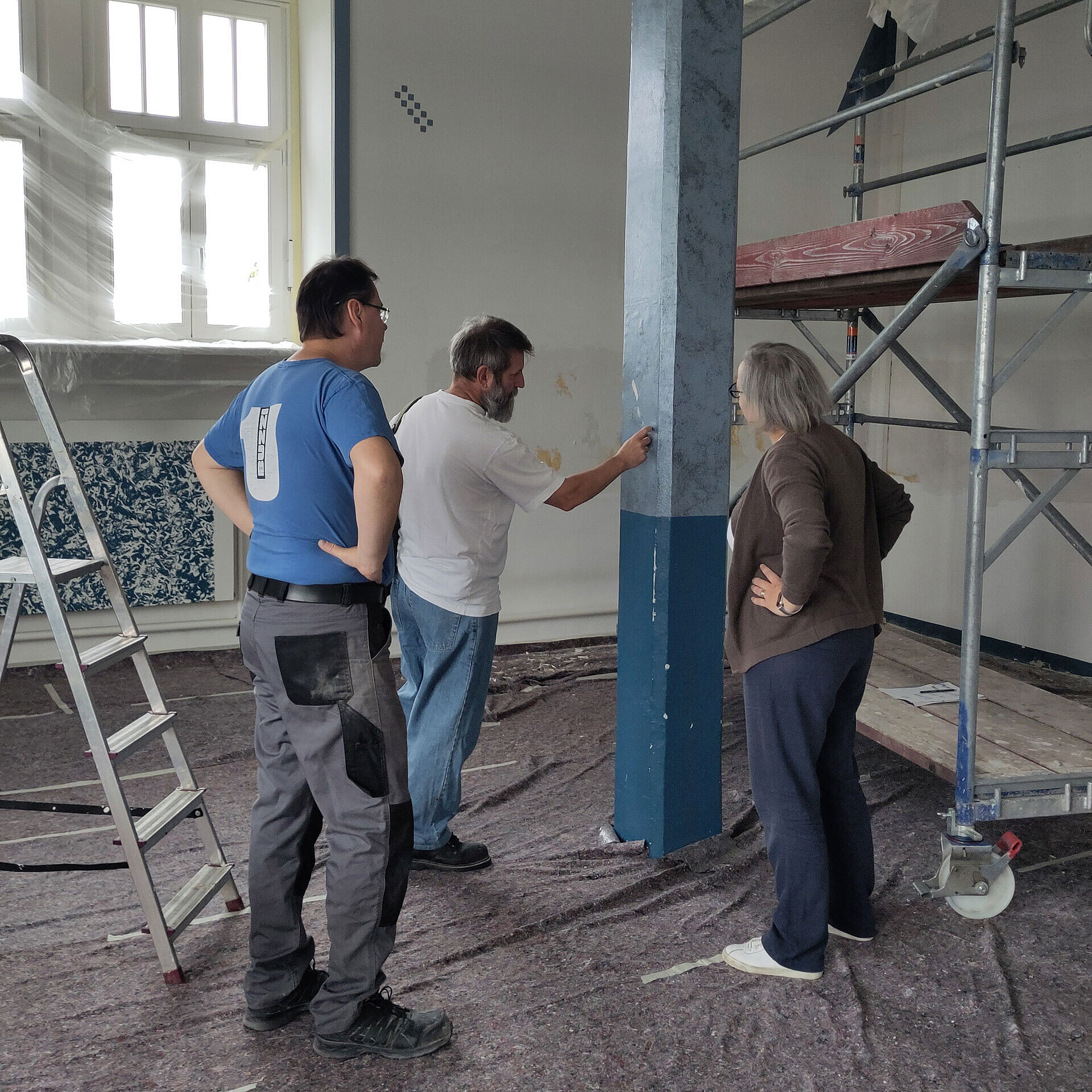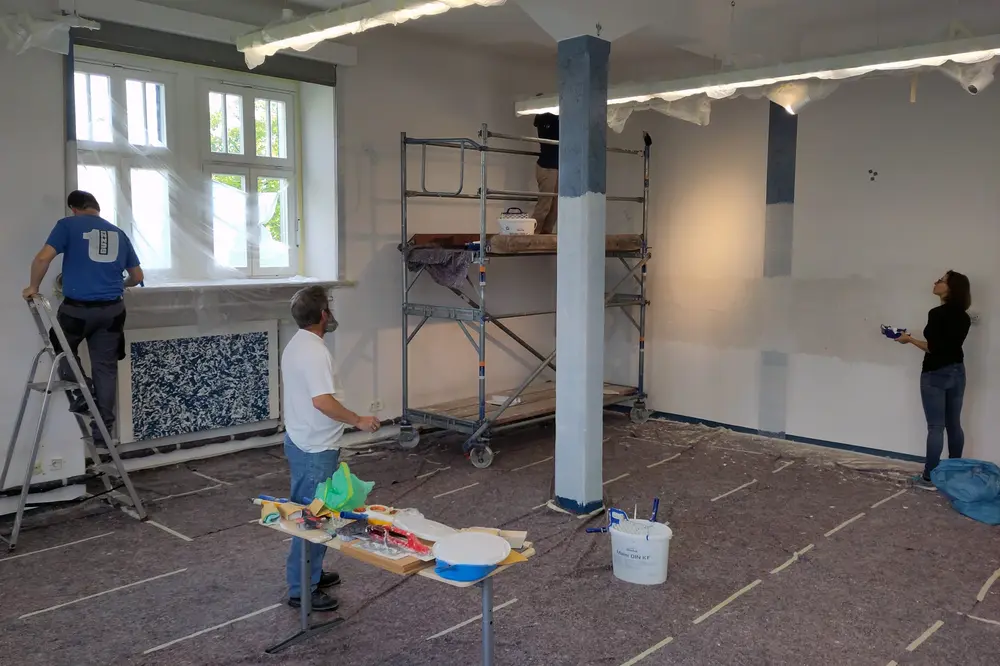 Alle Wände und die Decken wurden weiß gestrichen – der Grundstein für die farbliche Gestaltung der Wände, die durch eine Gruppe engagierter Mitarbeiter:innen eines anderen Wiesbadener Unternehmens übernommen wurde. So entstand ein neuer (T)Raum zum Lesen für die Biebricher Grundschulkinder.