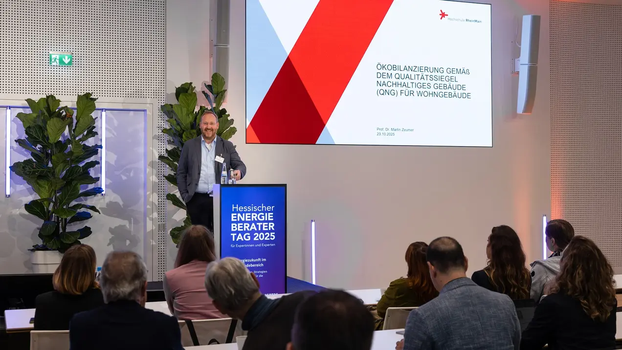 Prof. Dr.-Ing. Martin Zeumer steuerte zur Veranstaltung einen Vortrag zum Qualitätssiegel Nachhaltiges Gebäude (QNG) bei. Im Anschluss gab es die Möglichkeit, auch persönlich mit Unternehmen aus den Bereichen Planungssoftware und Heizungsbau in Kontakt zu treten.