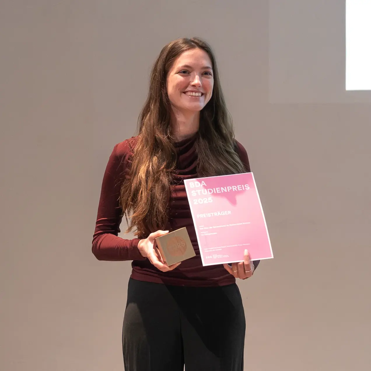 • Isabel Hiort wurde ausgezeichnet für „Ein Dach als Konstante – Wiederherstellung des Kreuzgangs“ am Kloster Eberbach. Ihre Arbeit überzeugte durch außerordentliche Sensibilität im Umgang mit dem historischen Bestand. Jurymitglied Nils Fröhlich betonte die Qualität der Annäherung: Der Entwurf verbinde „historische Tiefe, konstruktive Präzision und zeitgenössische Angemessenheit in vorbildlicher Weise“.