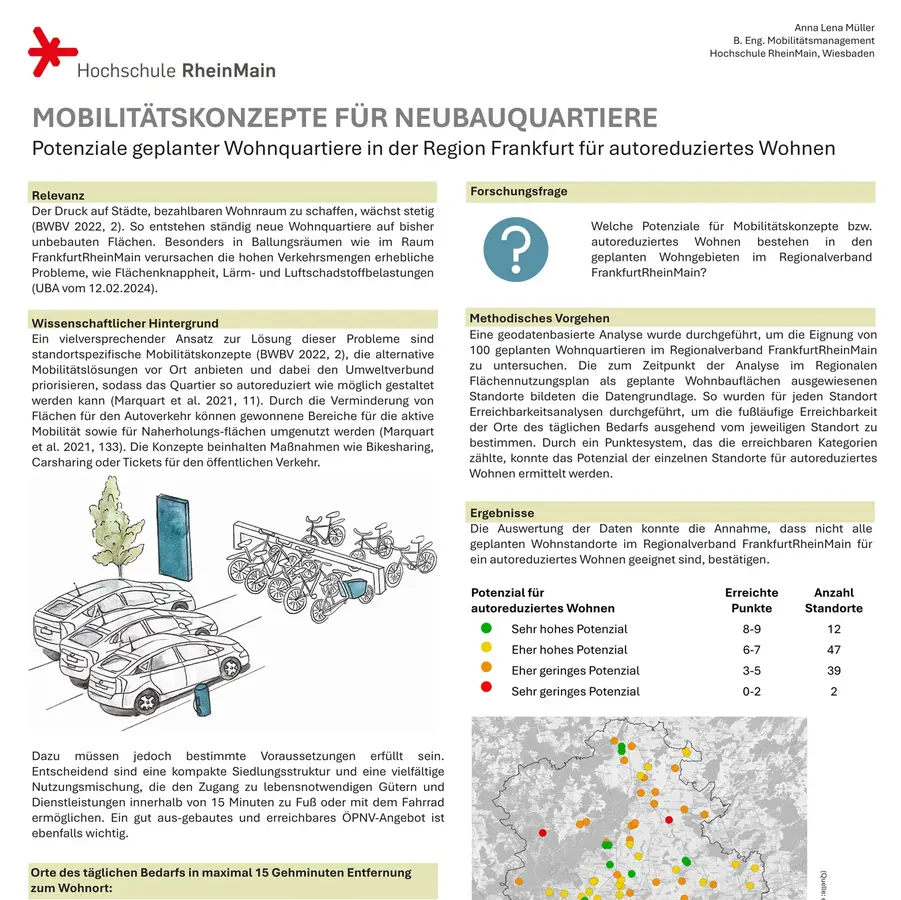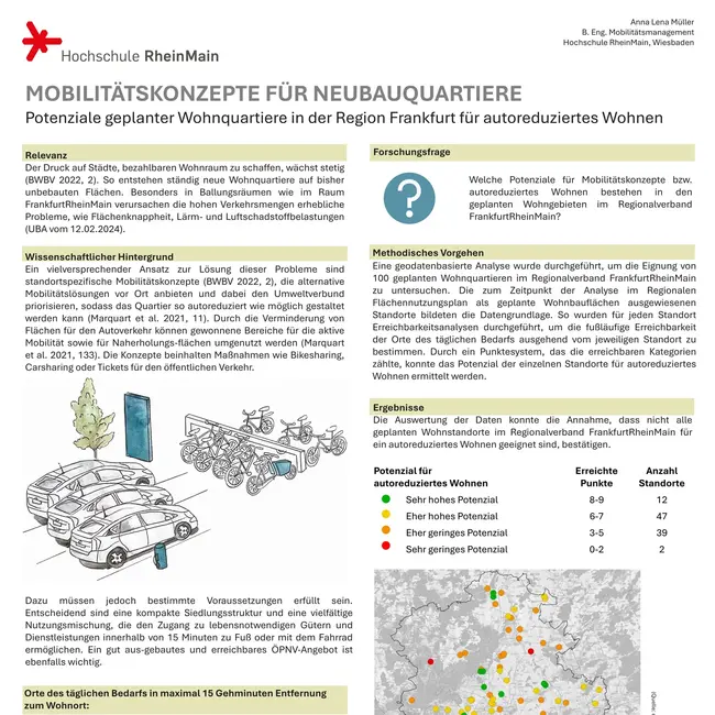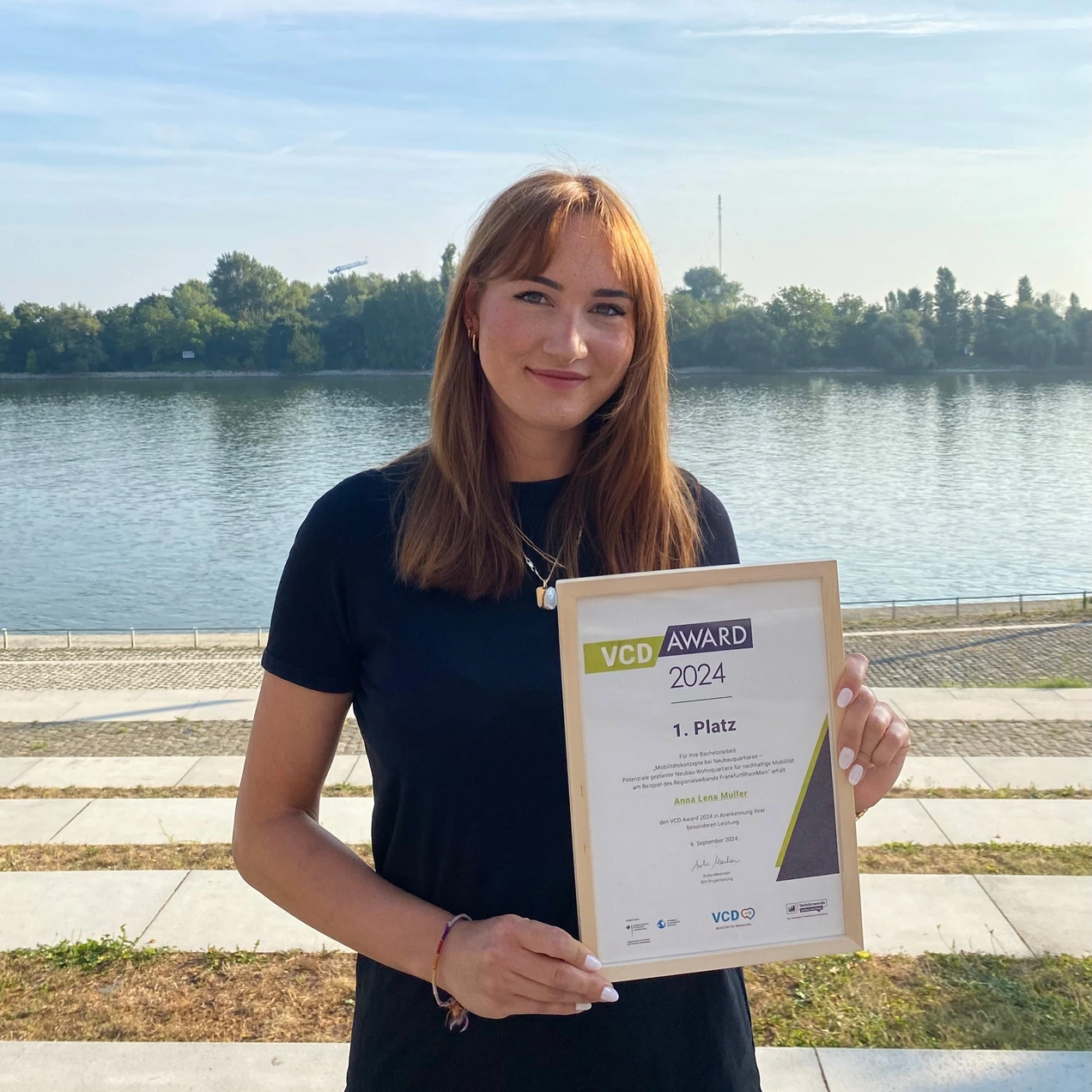 Anna Lena Müller, Absolventin des Bachelor Mobilitätsmanagement, wurde für ihre Abschlussarbeit mit dem 1. Platz beim VCD Award ausgezeichnet. Sie überzeugte die Jury, bestehend aus Vertreter:innen aus Lehre, Forschung und Verbänden, mit ihrer Arbeit zum Thema „Mobilitätskonzepte bei Neubauquartieren – Potenziale geplanter Neubau-Wohnquartiere für nachhaltige Mobilität am Beispiel des Regionalverbands FrankfurtRheinMain“. In ihrer Thesis untersuchte sie, wie nachhaltige Mobilität in neuen Wohngebieten des Regionalverbands FrankfurtRheinMain gefördert werden kann. Ihre Handlungsempfehlungen basieren dabei auf Praxisbeispielen aus Hessen.