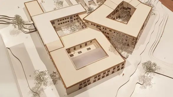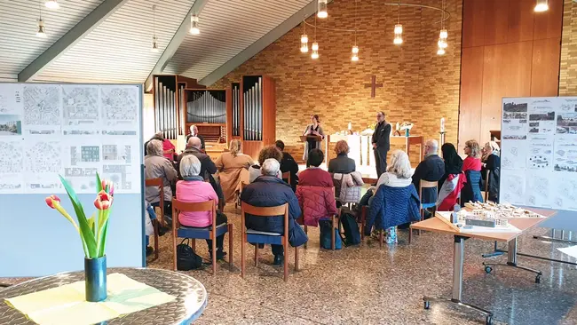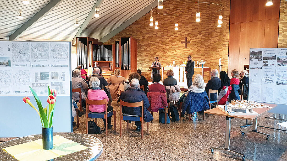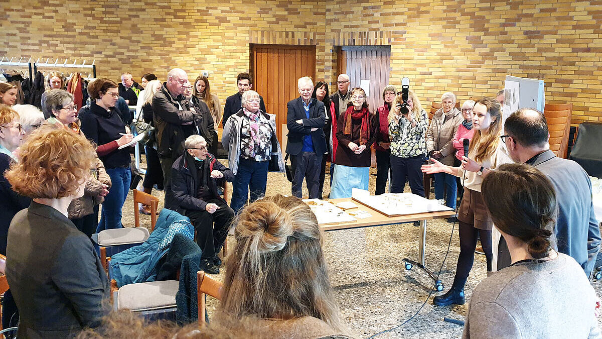 14.02.2023 - „Älterwerden im Quartier | Gut leben und wohnen auf dem Gräselberg“ – unter diesem Titel lud die Evangelische Lukasgemeinde Wiesbaden in die örtliche Lukaskirche ein, um Entwürfe für eine Neugestaltung des Grundstücks rund um das Gotteshaus vorzustellen. Präsentiert wurden die Konzepte und Modelle von Masterstudierenden der Hochschule RheinMain, die damit auch ihre Abschlussarbeiten im Studiengang Architektur | Bauen mit Bestand ausstellten.