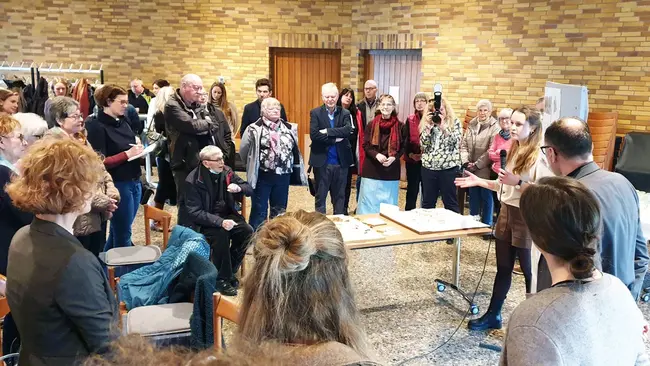 Die Präsentation stieß auf großes Interesse bei den Gemeindemitgliedern, war sie doch der erste Meilenstein eines Projekts der Lukasgemeinde älteren Menschen die Möglichkeit zu bieten, trotz Einschränkungen auf dem Gräselberg wohnen zu bleiben. „Ein Bürger wollte schon direkt zu Beginn des Prozesses eine Wohnung reservieren“, erzählte Pfarrerin Birte Kimmel, die sich sehr bei den Studierenden dafür bedankte, dass „Sie unseren Träumen Räume geben“. Die Kirche sei in einem Transformationsprozess, so Kimmel, hin von der Kirche des Volkes zu einer Kirche für das Volk. Ein solches Projekt zeige den praktisch handelnden Arm der Kirche und stimme sie hoffnungsvoll. Dies bestätigte auch Oliver Albrecht, Propst der Evangelischen Kirche Rhein-Main, der in seinem Grußwort das mutige Engagement aller Beteiligten lobte. Sozialdezernent Christoph Manjura stellte in seiner Ansprache unter anderem die sehr gute Zusammenarbeit zwischen Hochschule, Stadt und Kirche heraus.