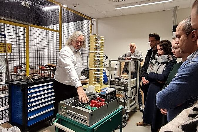 Anschließend begaben sich die Gäste auf eine Campustour und besichtigten mehrere Labore. Im Wasserstofflabor präsentierten Birgit Scheppat und Prof. Dr. Ulrich Rost, Professor für Wasserstofftechnologie und Energiespeicher und Nachfolger von Birgit Scheppat als Laborleiter, die Laborausstattung sowie verschiedene Studienprojekte. Uwe Trautmannsheimer, wissenschaftlicher Mitarbeiter im Wasserstofflabor, stellte MHyCube vor, einen Metallhydridspeicher für Wasserstoff. Dieses Forschungsprojekt wird durch das HOLM gefördert.