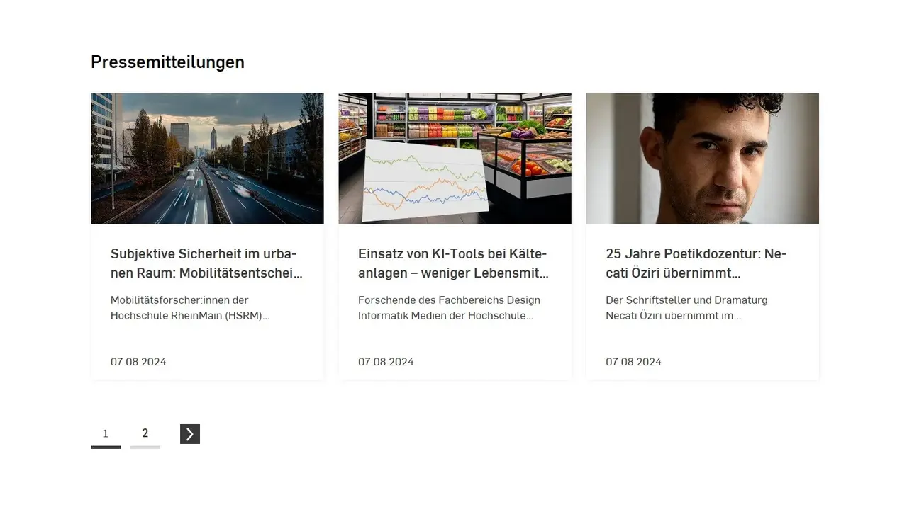 News (Meldungen) können nur in der vollen Breite, nicht in Spalten oder Akkordeons eingebunden werden. Sie werden in der Regel auf der Startseite des Fachbereichs oder der Einheit ausgegeben.