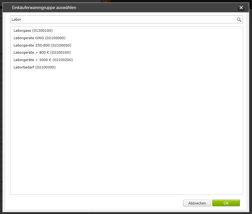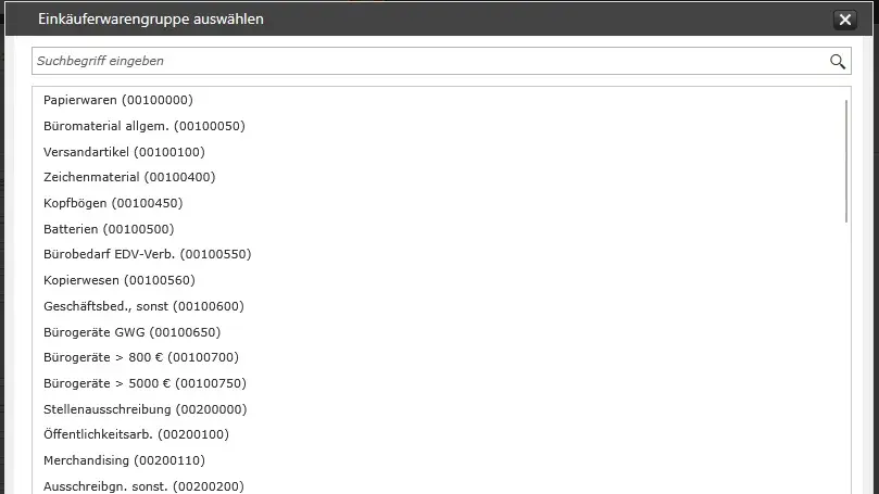 Wählen Sie die korrekte Einkäufer-Warengruppe aus. Durch klicken auf Ihre Auswahl wird diese ins Bestellformular übernommen.