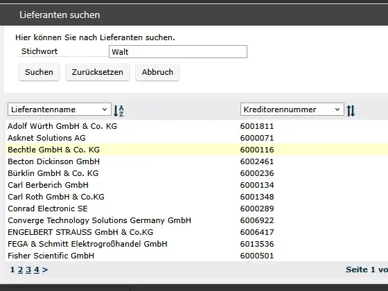 Dort öffnet sich dann das Suchfenster für Lieferanten. Im Eingabefeld Stichwort ist dann die Möglichkeit gegeben, den Namen des gesuchten Lieferanten einzugeben und dann auf Suchen unterhalb des Stichwort klicken. So erhält man folgendes Ergebnis: