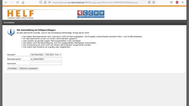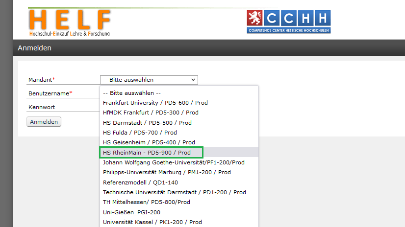 - Der Mandant: hier wählen Sie bitte die „HS Rhein Main – PD5-900 / Prod“ aus.