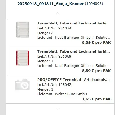 Alle weiteren Artikel kann man durch scrollen, über die auf - ∧ - und ab - ∨ - Pfeile, die sich unter bzw. über der Warenkorb-Artikelliste befinden, anzeigen lassen. → Abbildung unten