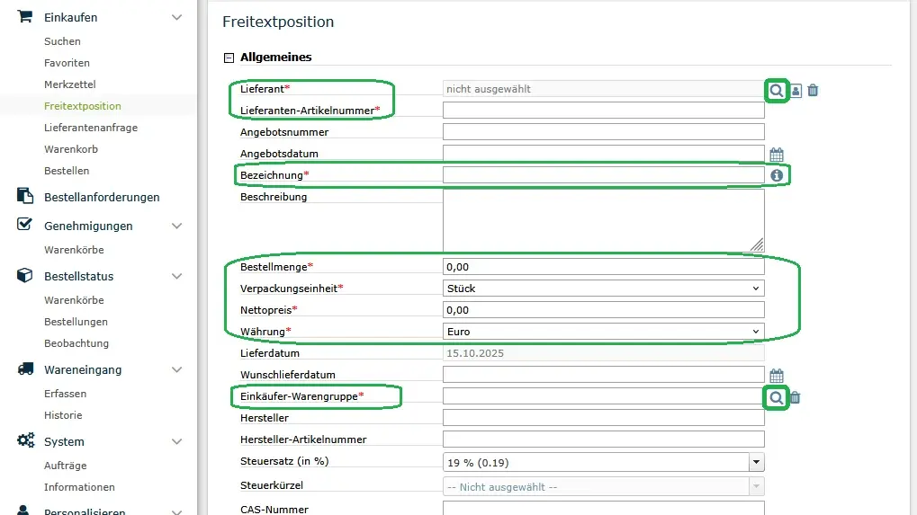 Mit Freitextbestellungen können Artikel bestellt werden, die zwar vom Lieferanten angeboten werden, die aber weder in den Katalogartikeln noch im Webshop zu finden sind. Gehen Sie im HELF-Navigationsmenü links unter Einkaufen auf den Punkt Freitextposition. Darauf öffnet sich nun die Eingabemaske der Freitextposition. Hier müssen dann die mit einem roten * gekennzeichneten Felder ausgefüllt werden.