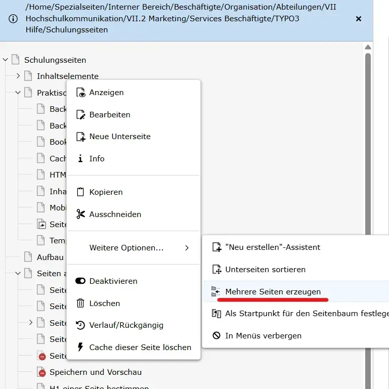 - Öffnen Sie das Kontextmenü durch Rechtsklick auf einen Eintrag im Seitenbaum unter dem die Seiten erscheinen sollen.