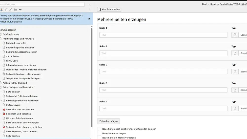 Die "Mehrere Seiten erzeugen"-Funktion ist ein praktisches Werkzeug, um mehrere Seiten auf einmal anzulegen.