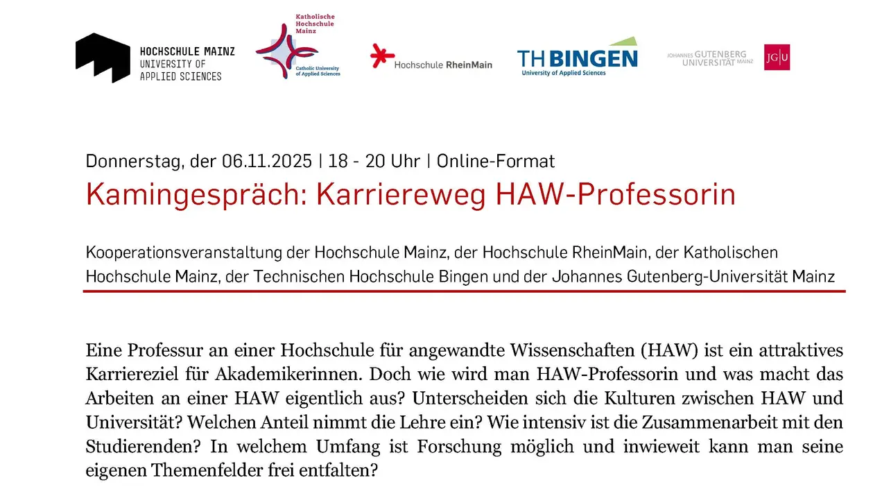 Anmeldung bis spätestens 30.10.2025 per Mail an: HAW-Professorin@hs-mainz.de