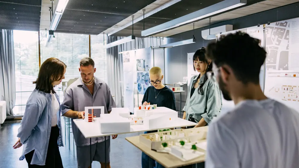 ...vermittelt eine generalistische, künstlerisch-gestalterische Qualifikation mit Design-Schwerpunkt. Mit einbezogen werden die handwerklich-künstlerisch orientierte Innenarchitektur, die Messe- und Ausstellungsarchitektur, die Neuen Medien mit virtueller Architektur und medialer Raumgestaltung sowie die Ausstattung von Bühne und Film.