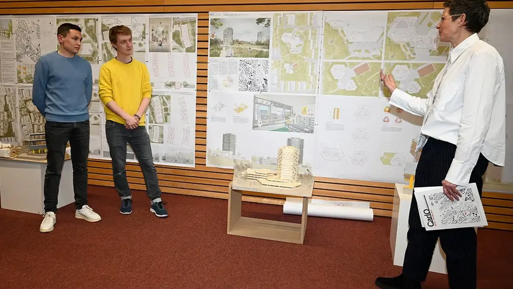 "The award recognizes particularly successful work. The "CarlO" design project is a task from a real-life situation, which is a very typical characteristic here at this university," said Prof. Dr. Andreas Brensing, Vice-President for Research, Transfer and Sustainability, at the opening of the exhibition. Dr. Marie-Luise Stoll-Stefan, Deputy Chairwoman of the Wiesbaden Foundation, then welcomed those present. "It is very nice that the students have the opportunity to exhibit their projects. The work they have produced is fantastic and has the potential to have a direct impact on Wiesbaden," she said. The works were judged by an external jury consisting of Mona Farag, architect at Christ & Gantenbein, Iris Gisi, Environmental Office of the City of Wiesbaden, Julian Numberger, landscape architect at NUWELA, and Alexander Harff, authorized signatory and division head of construction planning/preparation at Wiesbadener Wohnungsbaugesellschaft mbH. The project was conceived, supervised and continuously developed by the lecturers Prof. Isabella Leber, Julia Christ and Aldis Pahl.