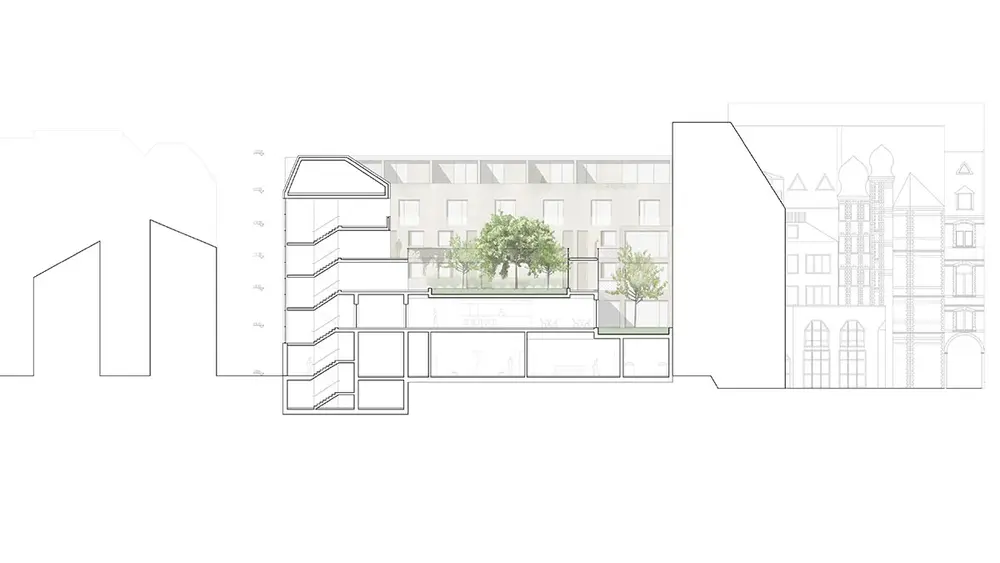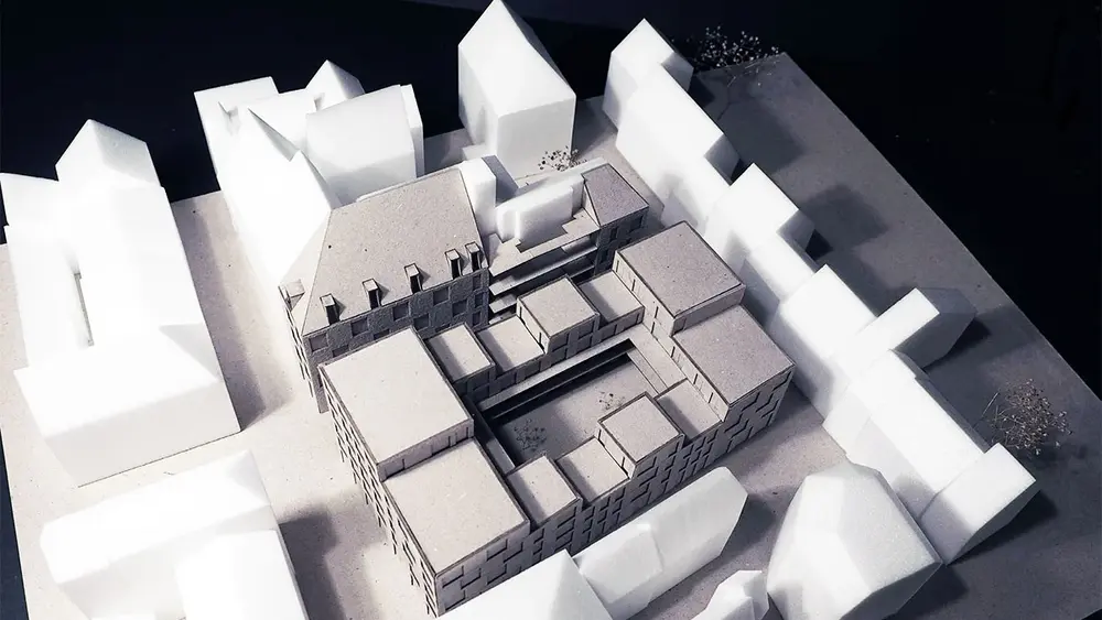 The future architect Malin Patschke is concerned with "creating living space for everyone in a relatively dense area", coupled with private or communal open spaces. The selection of commercial uses and the hostel are intended to further revitalize the city center. In her model, the site is divided by a new street between Langgasse and Wagemannstraße, thus breaking up the current building complex. Her fellow student Ole Burlandt also wants to create a mix of private spaces and public squares with his design, thereby creating "new perspectives and perceptions" for people.