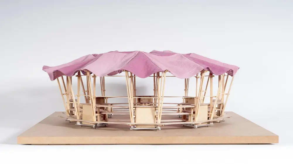 -Katharina Schön and Daniel Krönung received the award for their project "Amphitheater - Freiluftbühne von Lißberg", designed for the Oberhessen 2027 State Garden Show. The project impressed with its lightness and clarity - translucent, resource-saving, mobile and reusable. Jury member Julia Christ praised the design as Architecture "that focuses on change, openness and community". The open-air stage is "not a monument, but an invitation - a place that connects people and shows that Architecture is strong when it remains open: for movement, for change and for life itself."