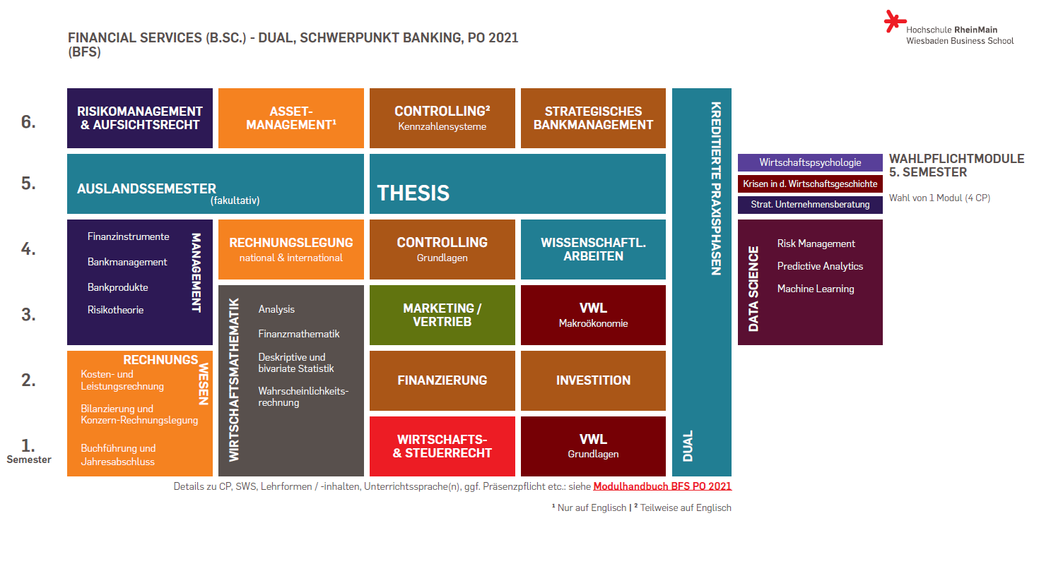 You will receive a foundational education in the fields of finance, data science, risk management, accounting, and controlling. Each semester, one module is replaced by a work phase at your partner company. You remain a full-time student, with study and work phases evenly balanced in this cooperative model.