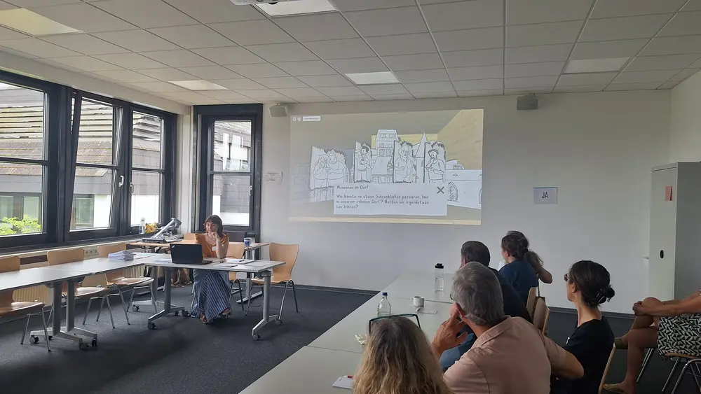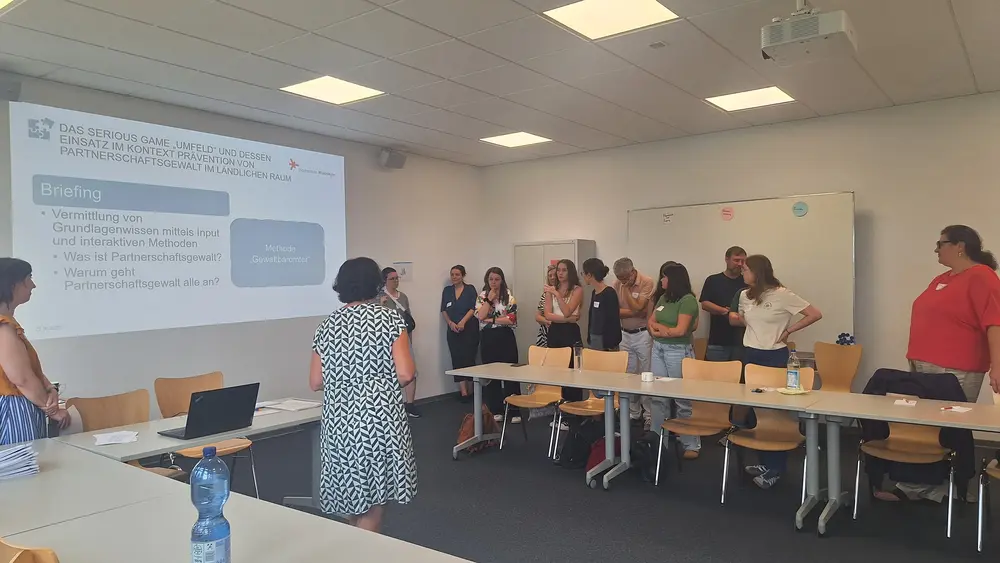 Das fünf Spielszenen sowie einen Pro- und einen Epilog umfassende Serious Game richtet sich an Erwachsene in ländlichen Regionen und möchte für die Bedeutung des Umfelds von Betroffenen und der Gemeinschaft als Ganzer im Umgang mit Gewalt in der Paarbeziehung sensibilisieren. Es eröffnet einen kreativen und niedrigschwelligen Zugang zu einem anhaltend tabuisierten Thema und lädt zur Selbstreflexion über eigenes (Nicht-)Handeln ein. Zugleich verdeutlicht das als Comic gestaltete Spiel, dass Partnerschaftsgewalt keine Privatangelegenheit ist, sondern eine Menschenrechtsverletzung und vermittelt Informationen über das psychosoziale Hilfe- und Unterstützungssystem für Gewaltbetroffene und Gewaltausübende.