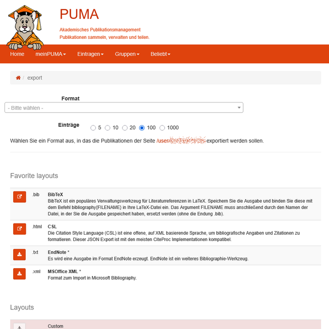 Je nach gewählter Option wird eine Webseite mit den entsprechend aufbereiteten Inhalten angezeigt (zum Kopieren oder Abspeichern) oder eine Datei im gewählten Format heruntergeladen.