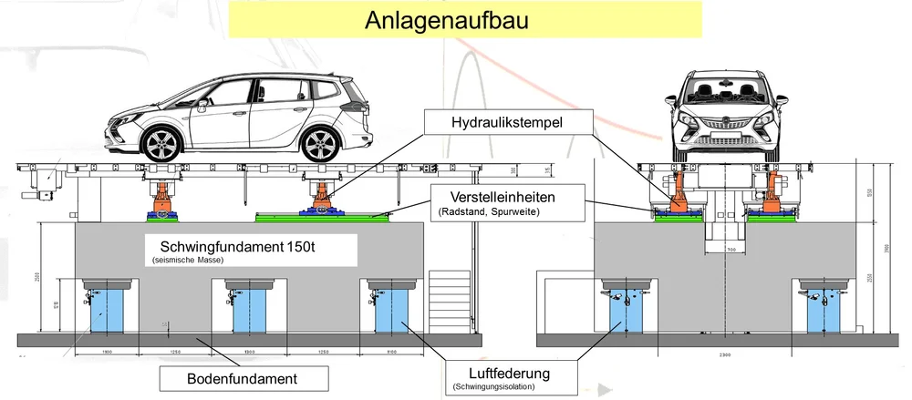 Die Anlage ist direkt mit dem Fahrzeug befahrbar (Oberkante FFB) und gestattet dadurch einen schnellen Wechsel des zu untersuchenden Fahrzeugs. Die Anlage erlaubt mit ihren technischen Eckdaten (Fzg.-Masse 2,5t / +-25kN Hydrozylinder / Frequenzgang 0 bis 100 Hz / Hub +-75 mm / MTS-Flex-Test-GT und RPC pro) Road to Rig, Full-Vehicle, Component, Durability, und HIL- Tests bis in den NVH - Bereich mit synthetischer oder "real-world"- Anregung.