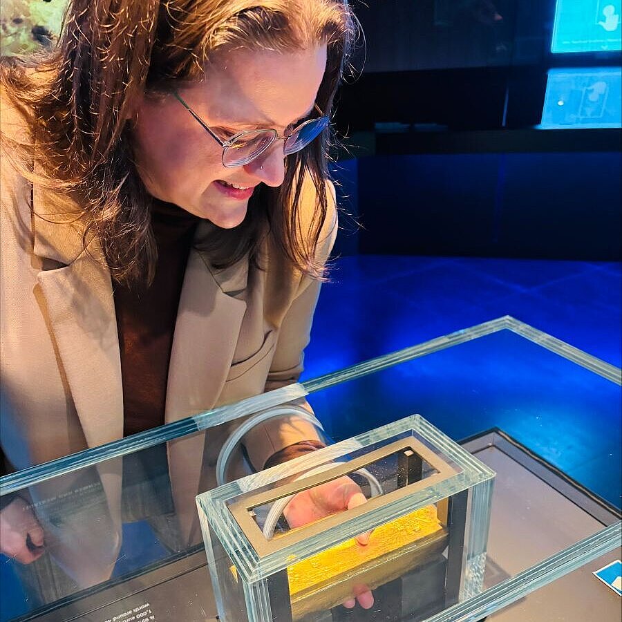 Als kleines Highlight konnten die Studierenden und begleitenden Professor:innen die Herausforderung eines Goldbarrens selbst erleben: Gut gesichert wurde ein 12,5‑Kilogramm-Goldbarren gehoben.