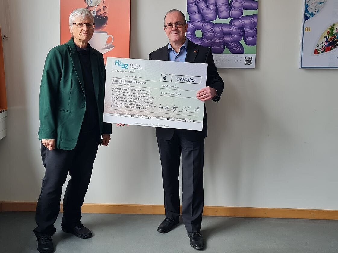 Prof. Dr. Birgit Scheppat erhält von der H2BZ-Initiative Hessen einen Scheck über 500 Euro für ihr außergewöhnliches Engagement im Bereich Wasserstoff.