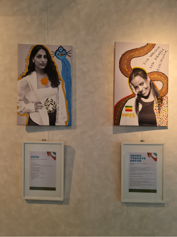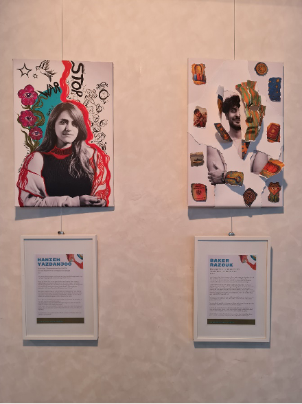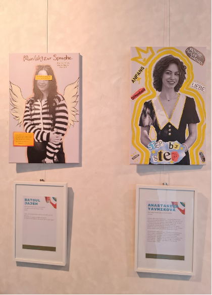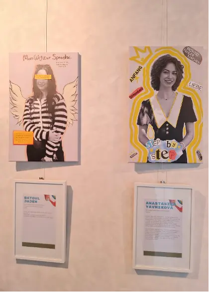In sieben großen Porträt-Collagen stellten Geflüchtete dar, wie sich ihre Identität durch die intensiven Erfahrungen des persönlichen Umbruchs veränderte und sich ihnen durch das Erlernen der deutschen Sprache allmählich neue Perspektiven eröffneten.