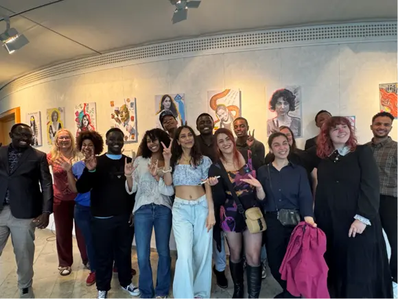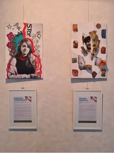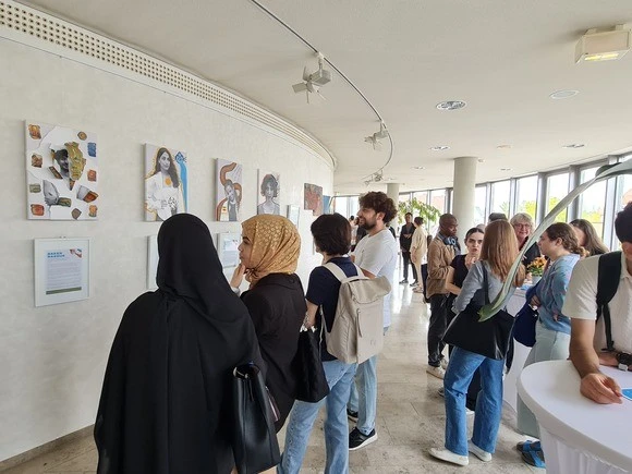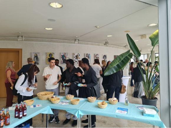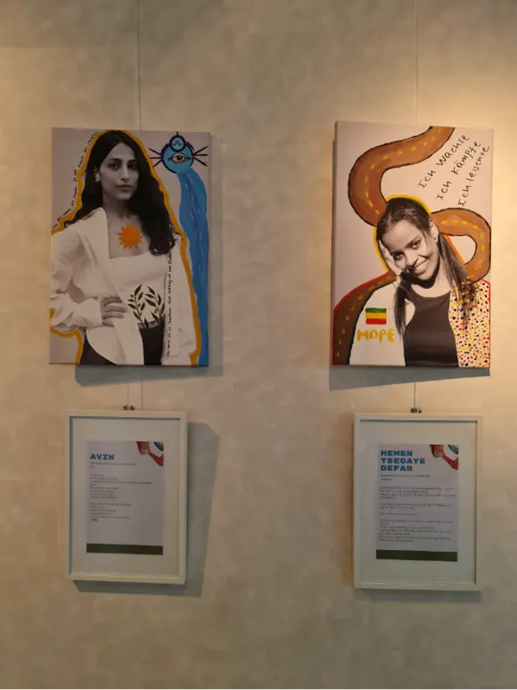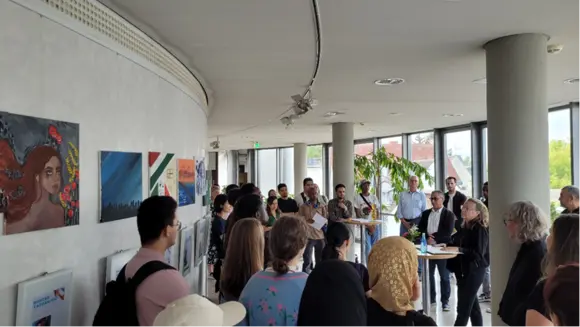 Einige Künstler:innen waren persönlich anwesend: Fateme, Avin, Hanieh, Baker, Georgina und Magd. Die beiden Ausstellungen im schönen Rathaus boten einen idealen Rahmen für ein großes Begegnungsfest unter internationalen Studierenden, einige zum Teil gerade erst aus Kenia, Mauritius, dem Iran und der Ukraine angereist, und Personen, die sich schon lange in verschiedenen Initiativen in der Stadtgesellschaft für Internationalität in der Stadt engagieren.