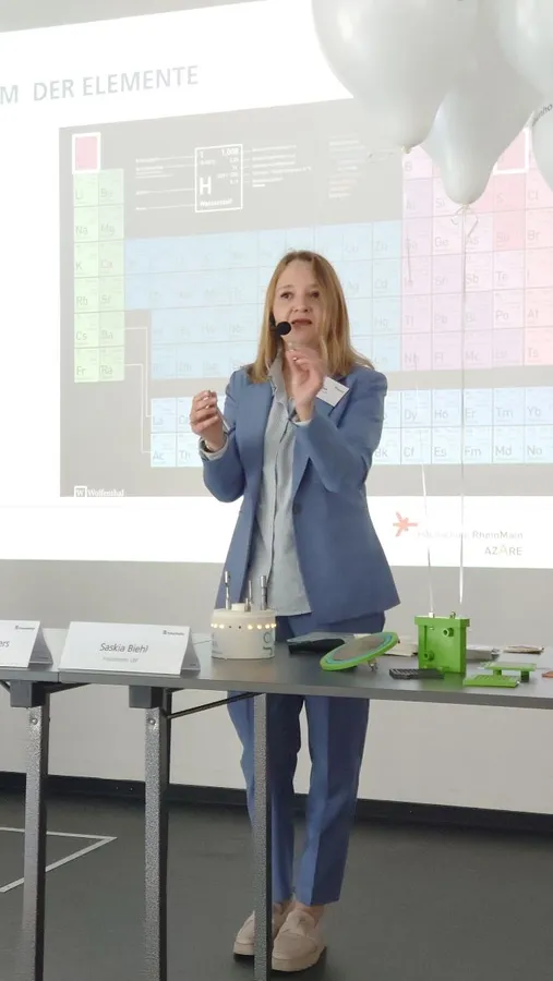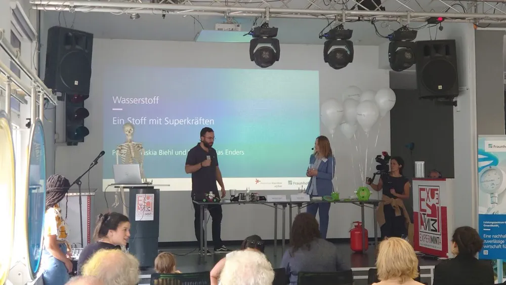 Die Eröffnung übernahmen Prof. Saskia Biehl und Dr. Matthias Enders, die beide wissenschaftliche Mitarbeitende am LBF wie auch an der Hochschule RheinMain sind. In ihrer Wasserstoffvorlesung nutzten die beiden Wissenschaftler Exponate des Labors für Wasserstofftechnologie und Energiespeicher von Prof. Birgit Scheppat, um die Wasserstoffherstellung mittels Elektrolyseur wie auch die Wasserstoffwandlung in elektrische Energie mittels Brennstoffzelle zu veranschaulichen.