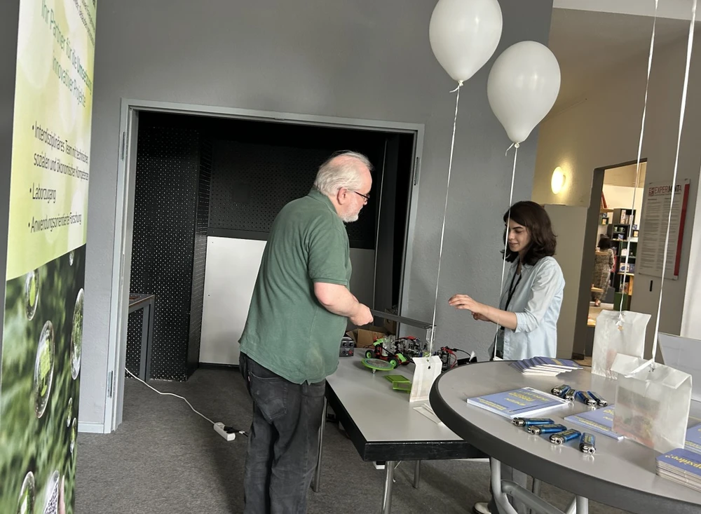 Im Anschluss an die Vorlesung wurden die Exponate in der gemeinsamen Ausstellung von Georg Derscheid, wissenschaftlicher Mitarbeiter der Hochschule RheinMain, vorgestellt worden. Dort haben sich das Forschungszentrum azare wie auch RheinMain StartUpLabs, vertreten durch die Gründungsmanagerin Dr. Vbronia Saeed, der Hochschule präsentiert.