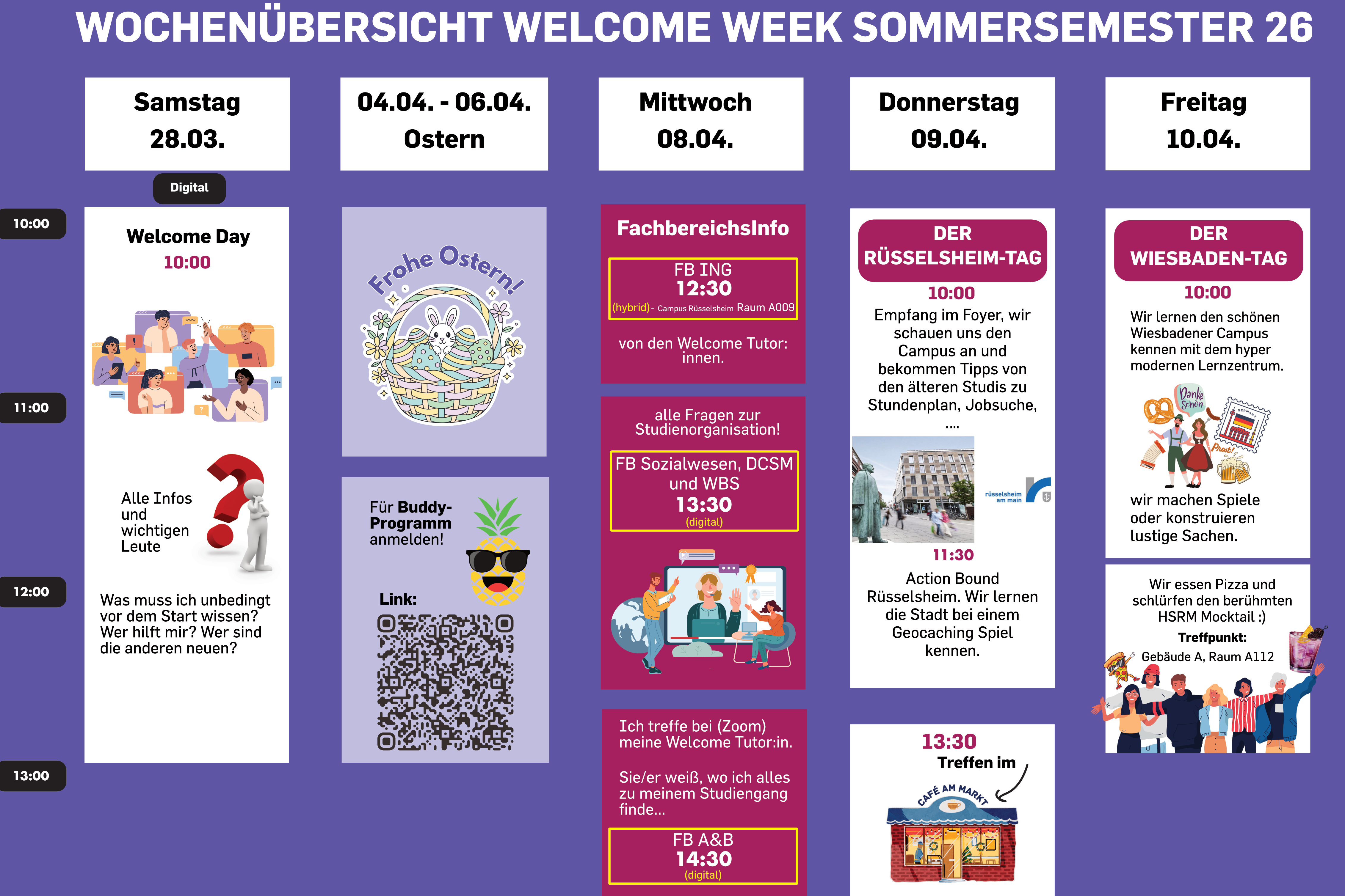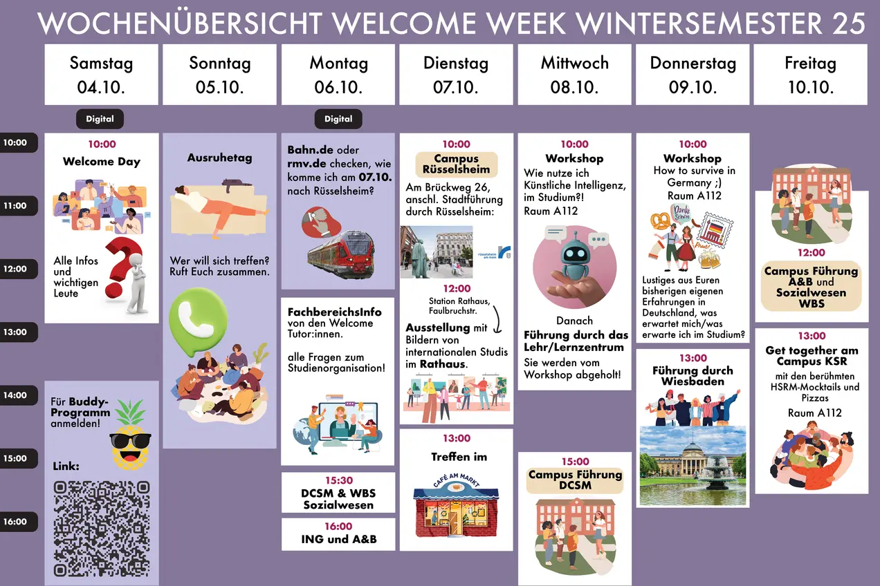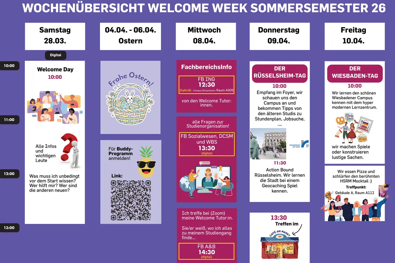 Unser Ziel der Welcome Week ist es, Sie bestmöglich auf den Studienbeginn vorzubereiten und eine schnelle Integration in das Studienleben und die Hochschule RheinMain zu ermöglichen. Wir empfehlen daher dringend, daran teilzunehmen!