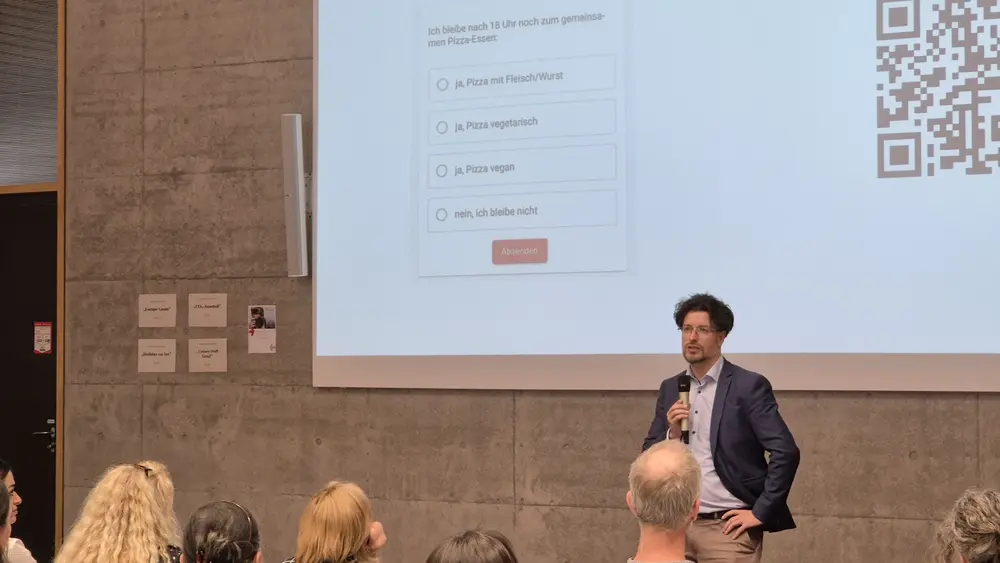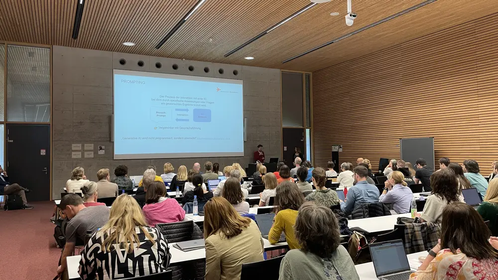 Die über 90 Teilnehmenden wurden von Prof. Dr. Christian Schachtner, Vizepräsident für Bildung und Nachhaltigkeit, begrüßt. Nach einer kurzen Einführung in verschiedene Prompting-Techniken und einem Überblick der im KI@HSRM-Portal zur Verfügung gestellten KI-Modelle durften sich die Teilnehmenden eine von vier Challenges zur Bearbeitung aussuchen. Die von Professor:innen der HSRM vorbereiteten Herausforderungen waren an konkrete Forschungsfragen angelehnt und deckten so unterschiedliche Bereiche wie Emissionsreduktion im Verkehrssektor bis hin zur Bewerbung einer kleinstädtischen Parfümerie ab.