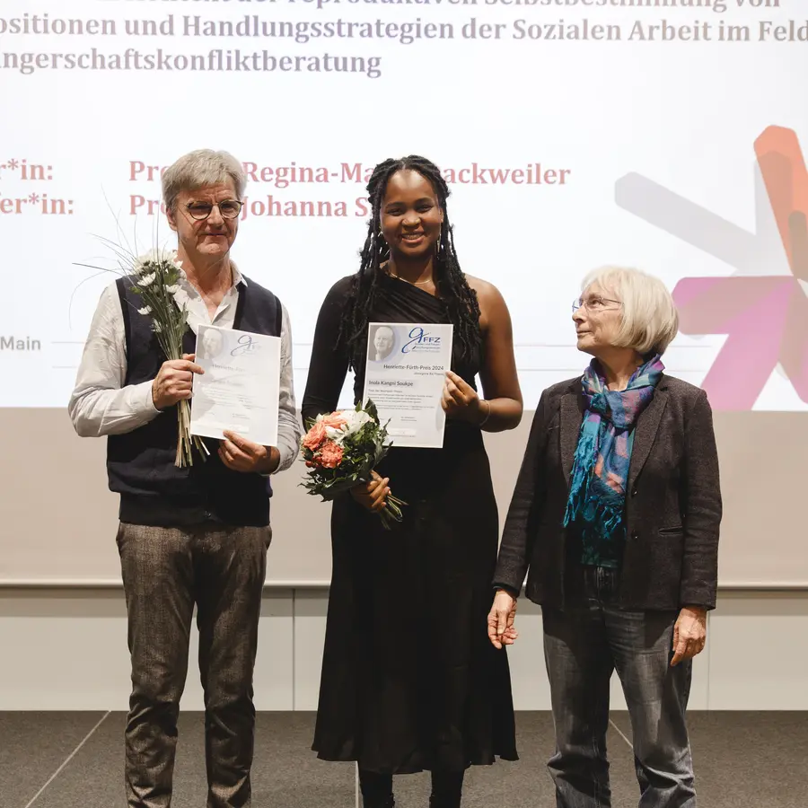 Nach den Grußworten verlieh Prof. Dr. Lotte Rose, Geschäftsführerin des Gender- und Frauenforschungszentrums der Hessischen Hochschulen (gFFZ), den Henriette-Fürth-Preis 2024 an Inola Kangni Soukpe für ihre Bachelor-Thesis „Empowerment Schwarzer Mädchen im Kontext Sozialer Arbeit: Konzeption einer Projektwoche zur intersektionalen Diskriminierung und zu empowernden Safer Spaces“.
