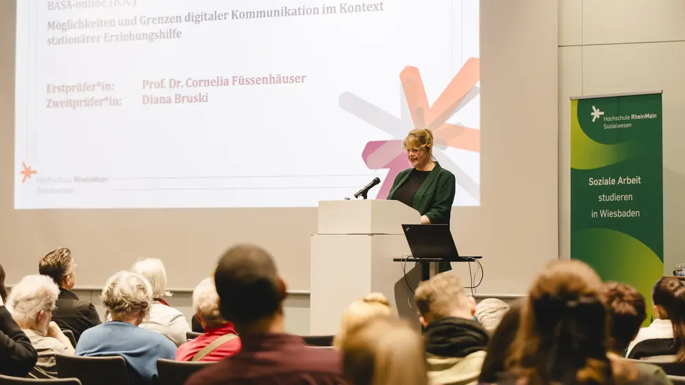 Ein weiteres Grußwort kam von Dr. Patricia Becher, Dezernentin für Soziales, Bildung und Wohnen der Landeshauptstadt Wiesbaden, welche sich dankbar zeigte für die intensivierte Zusammenarbeit zwischen dem Sozialdezernat der Stadt Wiesbaden und der HSRM. Sie ermögliche fachlichen Austausch, die Vergabe von Praktika und Berufseinstiegspositionen, aber auch Kooperationen wie die gemeinsame Aufbereitung der Geschichte des Wiesbadener Jugendamts zu dessen 100-jährigen Jubiläum.