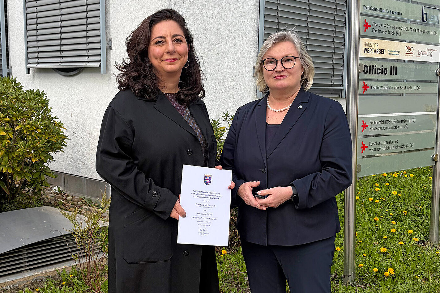 „Faraneh Farnoudi bereichert seit mehreren Jahren die Lehre an der Hochschule RheinMain mit ihrer Expertise in den Fachgebieten Entwerfen und Baukonstruktion, Entwurfsstrategien des Bauens im Bestand und Projektarbeit. Ich freue mich sehr, sie nun als Honorarprofessorin für das Fachgebiet Generatives Entwerfen und KI in der Architektur im Fachbereich Architektur und Bauingenieurwesen berufen zu haben“, so Prof. Dr. Waller.