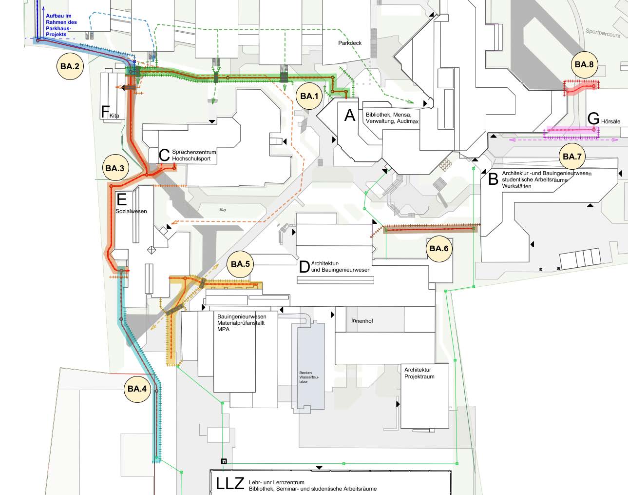 - Ab 20.04.2026 | Baustellenplan | Dauer: 4-5 Monate: Baustelle rund um die neue Glasfaserverkabelung, die die Öffnung von Gräben für Leerrohre beinhaltet. Die Zugänglichkeit zu den Gebäuden des Campus ist gegeben, es kann jedoch zu Behinderungen in der Wegeführung kommen.