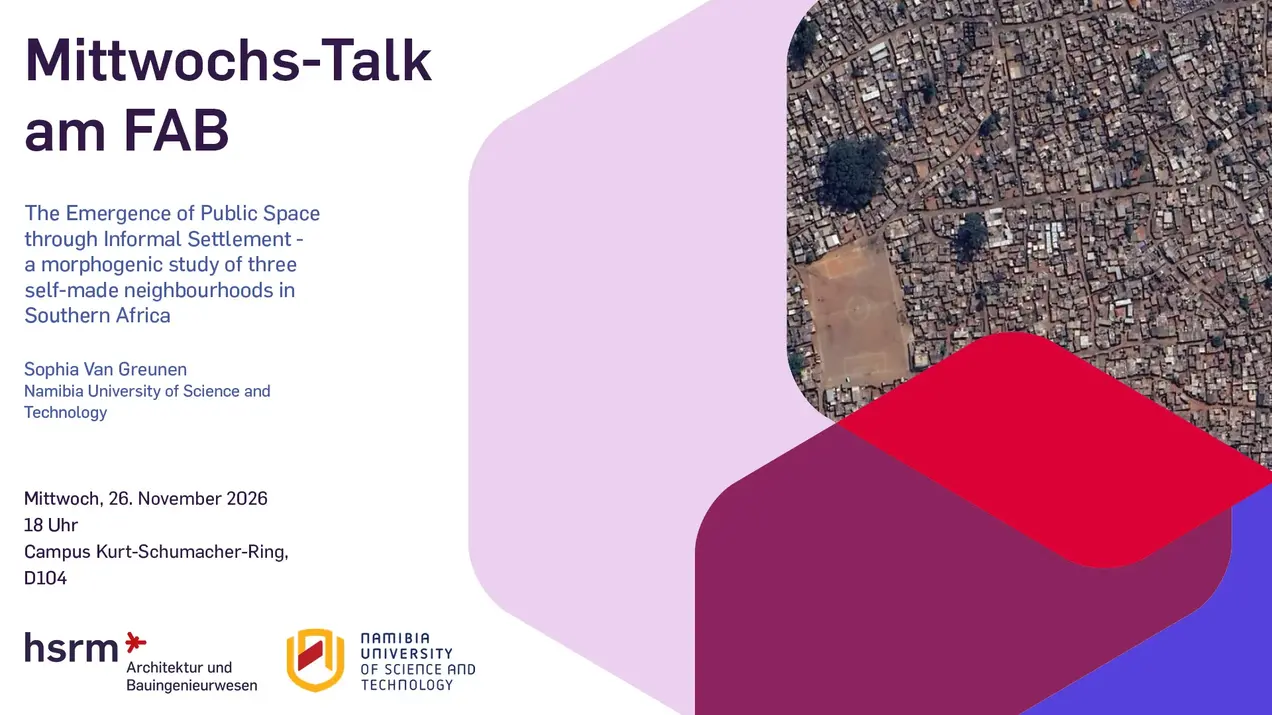 Sophia Van Greunen hält im Rahmen ihres Besuchs an der Hochschule RheinMain einen Vortrag zum Thema “THE EMERGENCE OF PUBLIC SPACE THROUGH INFORMAL SETTLEMENT - a morphogenic study of three self-made neighbourhoods in Southern Africa”.