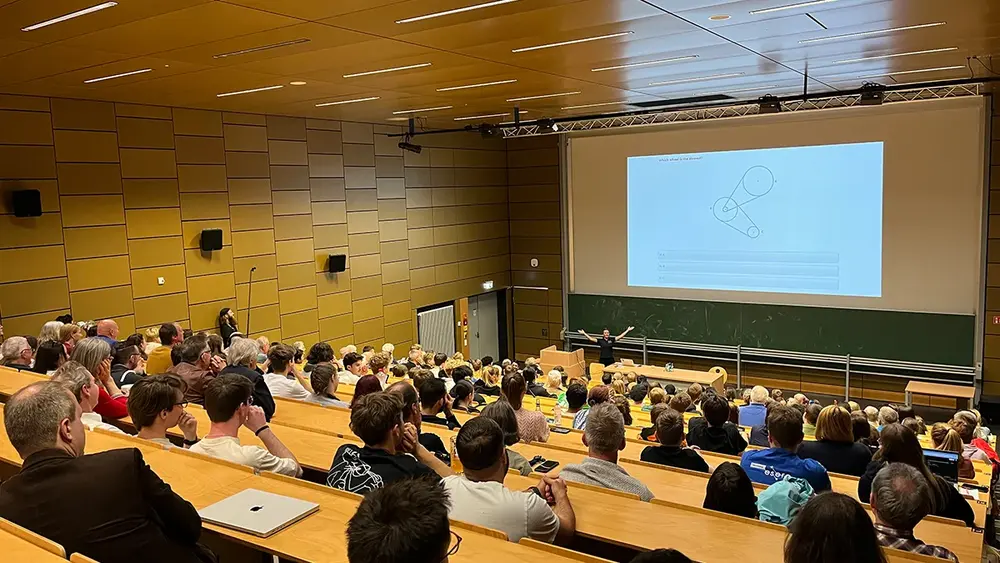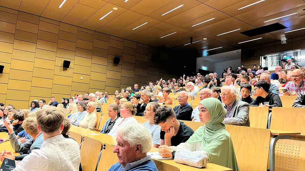 Wie lange der Weg zur Astronautin ist und wie viel Freude er bringt, weiß Amelie Schoenenwald mit viel Leidenschaft zu erzählen. Dem begeisterten Publikum berichtete sie von Tauchgängen, Parabelflügen und Überlebenstrainings im Schnee. Ebenso wichtig seien Teamwork-Übungen, der Theorieunterricht sowie das Medientraining und Sport. All diese Erfahrungen würden die gemeinsam trainierenden Reserve-Astronaut:innen zusammenschweißen und so eine weltumspannende Familie schaffen. Nach ihrem Vortrag beantworte Amelie Schoenenwald die vielen Fragen der Zuhörenden: Was muss man als Astronaut:in mitbringen? Gibt es ein Mindestalter? Und darf man Allergien oder Höhenangst haben? Am wichtigsten sei jedoch vor allem Neugier. „Bleibt neugierig und stellt immer viele Fragen“, gab Amelie Schoenenwald den Schüler:innen mit auf den Weg.