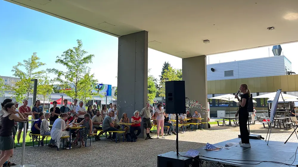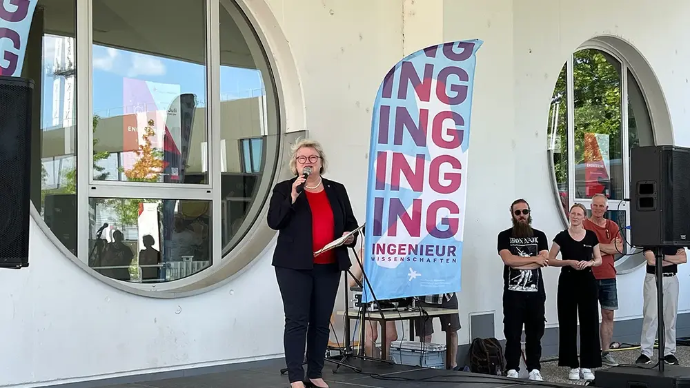 Bei strahlendem Sonnenschein begrüßte die Präsidentin der Hochschule RheinMain (HSRM) Prof. Dr. Eva Waller die Anwesenden: „Wie schön, dass Sie heute hier sind, um einen lebendigen Einblick in die Welt der Ingenieurwissenschaften zu bekommen.“
