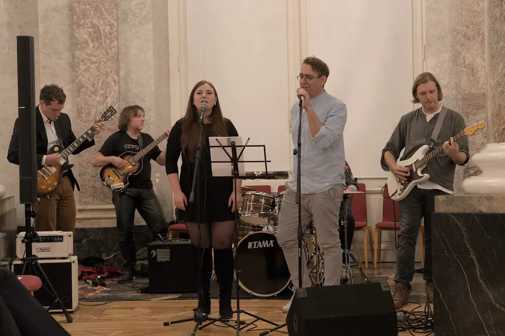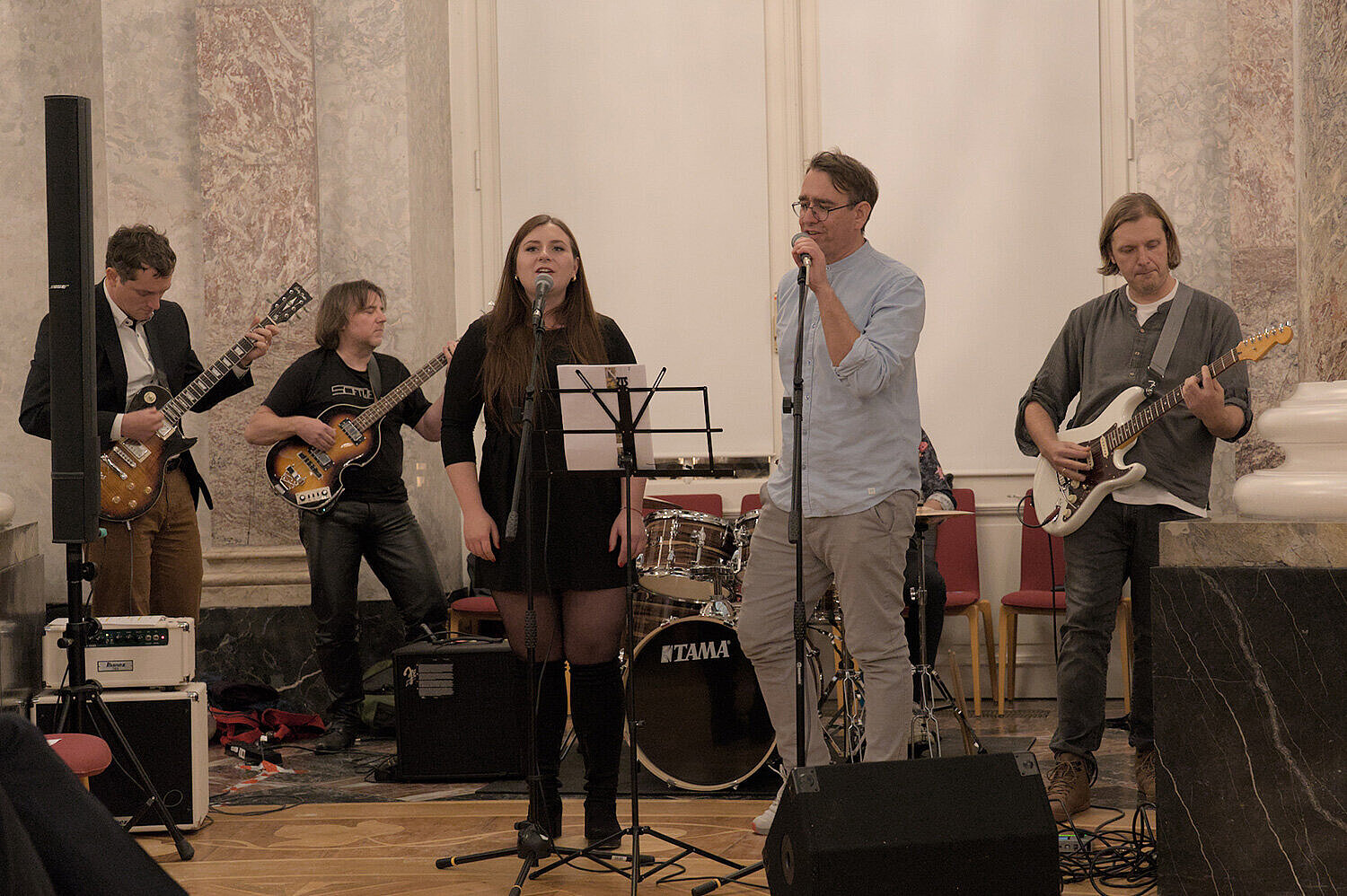46 Absolvent:innen der Informatik-Studiengänge an der Hochschule RheinMain (HSRM) haben am vergangenen Freitag im Schloss Biebrich ihren erfolgreichen Abschluss gefeiert. Musikalisch untermalt wurde die Veranstaltung wie gewohnt von der Band „Softwerk“, die sich aus Professoren und weiteren Beschäftigten der Studiengänge zusammensetzt und mit ihren Cover-Versionen bekannter Rock-Hits mittlerweile fester Bestandteil der eigenen Abschlussfeiern ist.