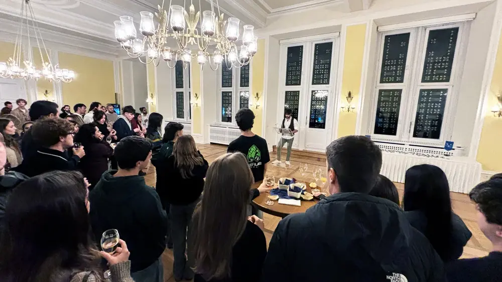 Bevor die Studierenden bei Sekt und Musik ins Gespräch kamen, berichteten Koushik Makesh von der Hochschule Fresenius und Hanieh Yazdanjoo von der HSRM von ihren ersten Tagen in Deutschland und wie sie in ihr Studium in Wiesbaden gestartet waren.
