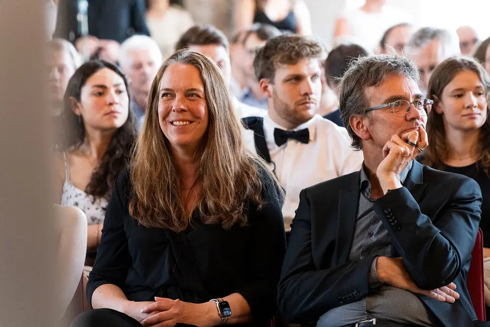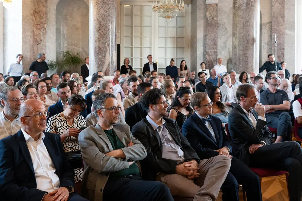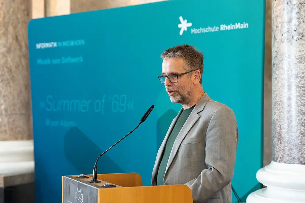 Die offizielle Eröffnung der Feier übernahm anschließend Prof. Dr. Martin Gergeleit. Der Informatiker und Prodekan des Fachbereichs Design Informatik Medien beglückwünschte die Absolvent:innen im Namen des Dekanats und verwies auf die gewachsene Bedeutung des Berufsfelds: „Die Informatik wird immer mehr zur Schlüsseldisziplin, nicht zuletzt aufgrund der rasanten Entwicklungen im Bereich KI. Durchschnittliches Wissen reicht nicht mehr aus. Als Absolvent:innen haben Sie daher beste Voraussetzungen.“ Die Glückwünsche des Präsidiums überbrachte Prof. Dr. Christian Schachtner. „Sie alle haben ein anspruchsvolles Studium absolviert, sind drangeblieben und haben sich durchgebissen. Darauf können Sie stolz sein!“, so der HSRM-Vizepräsident für Bildung und Nachhaltigkeit.