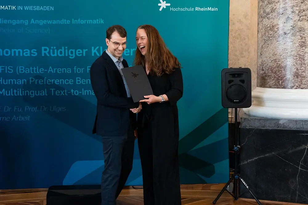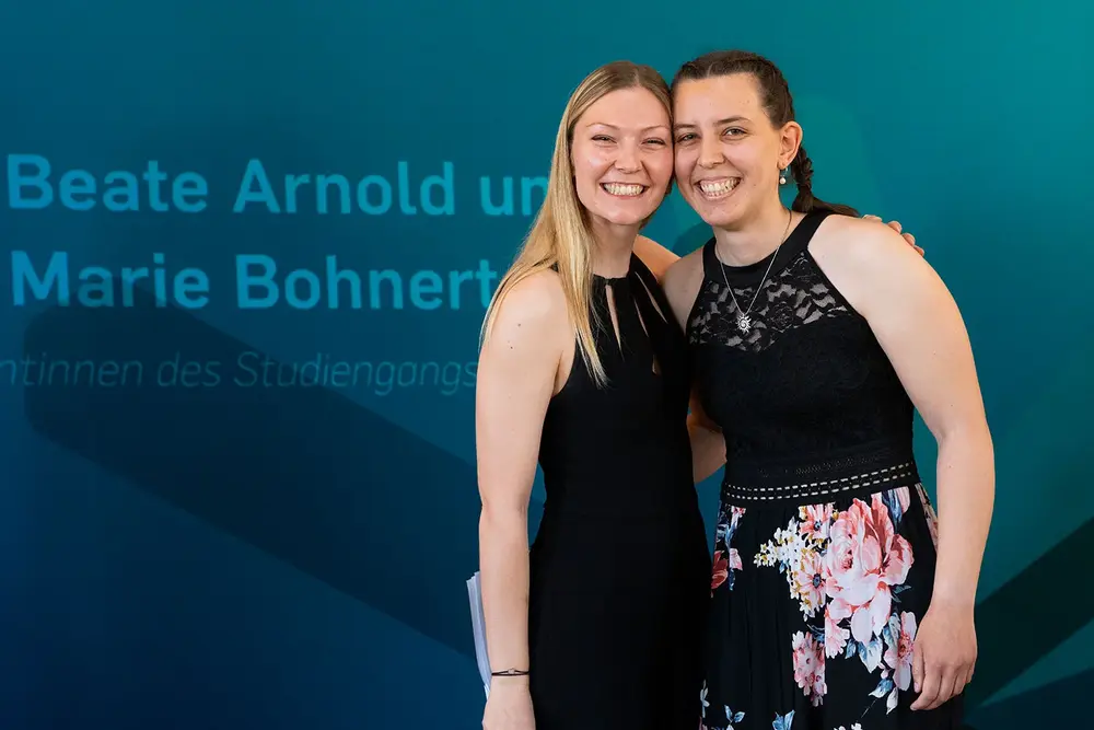 Gebührend gefeiert wurden an diesem Abend auch Beate Arnold und Marie Bohnert. Die beiden Absolventinnen der Medieninformatik ließen ihr Studium in einer gemeinsamen Abschlussrede Revue passieren – und sparten dabei nicht mit humorvollen Spitzen. Nach dem Studienstart unter Corona-Bedingungen und einem Discord-Server als digitaler Treffpunkt seien die ersten Präsenzveranstaltungen nicht weniger als ein soziales Experiment gewesen. Einen großen Dank sprachen die beiden Informatikerinnen daher allen Professor:innen aus. Der außergewöhnlich enge und persönliche Kontakt zu den Lehrenden sei ein echtes Alleinstellungsmerkmal der Informatik an der HSRM.