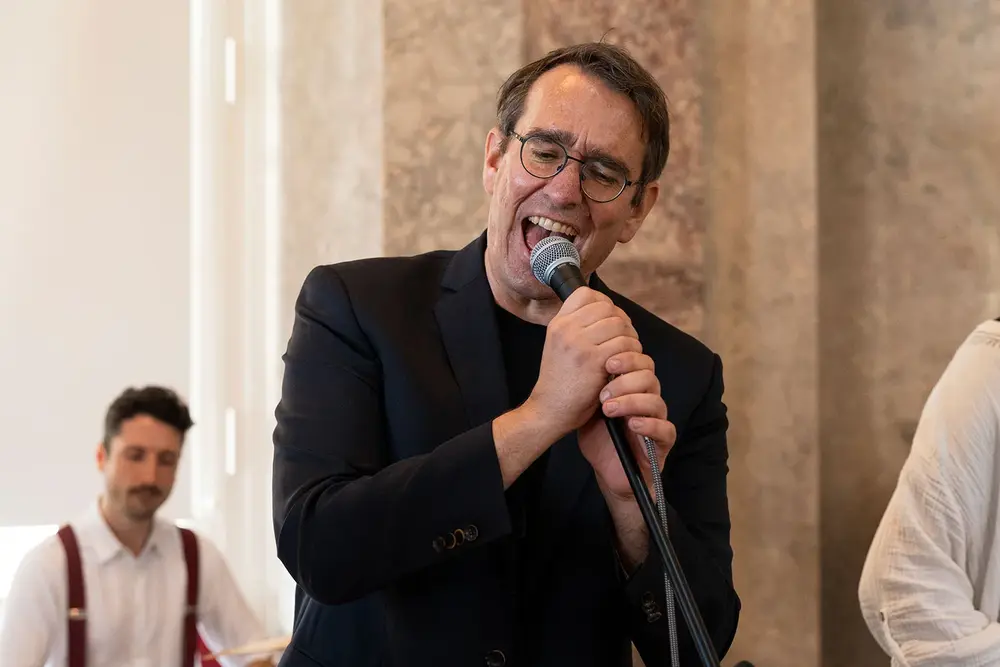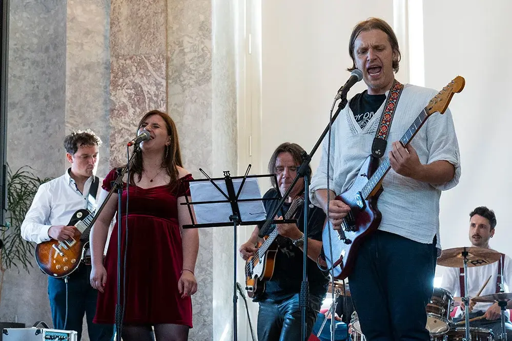 46 Bachelor- und sechs Masterabsolvent:innen der Informatik-Studiengänge an der Hochschule RheinMain (HSRM) haben am vergangenen Freitag im Schloss Biebrich ihren erfolgreichen Abschluss gefeiert – gemeinsam mit Freunden, Familie und der Band „Softwerk“. Vier Professoren und ein wissenschaftlicher Mitarbeiter waren gemeinsam mit einer Alumna des Studiengangs Innenarchitektur für die musikalische Untermalung der Feierlichkeiten zuständig und sorgten mit „Summer of 69“ zum Auftakt für die passende Stimmung.