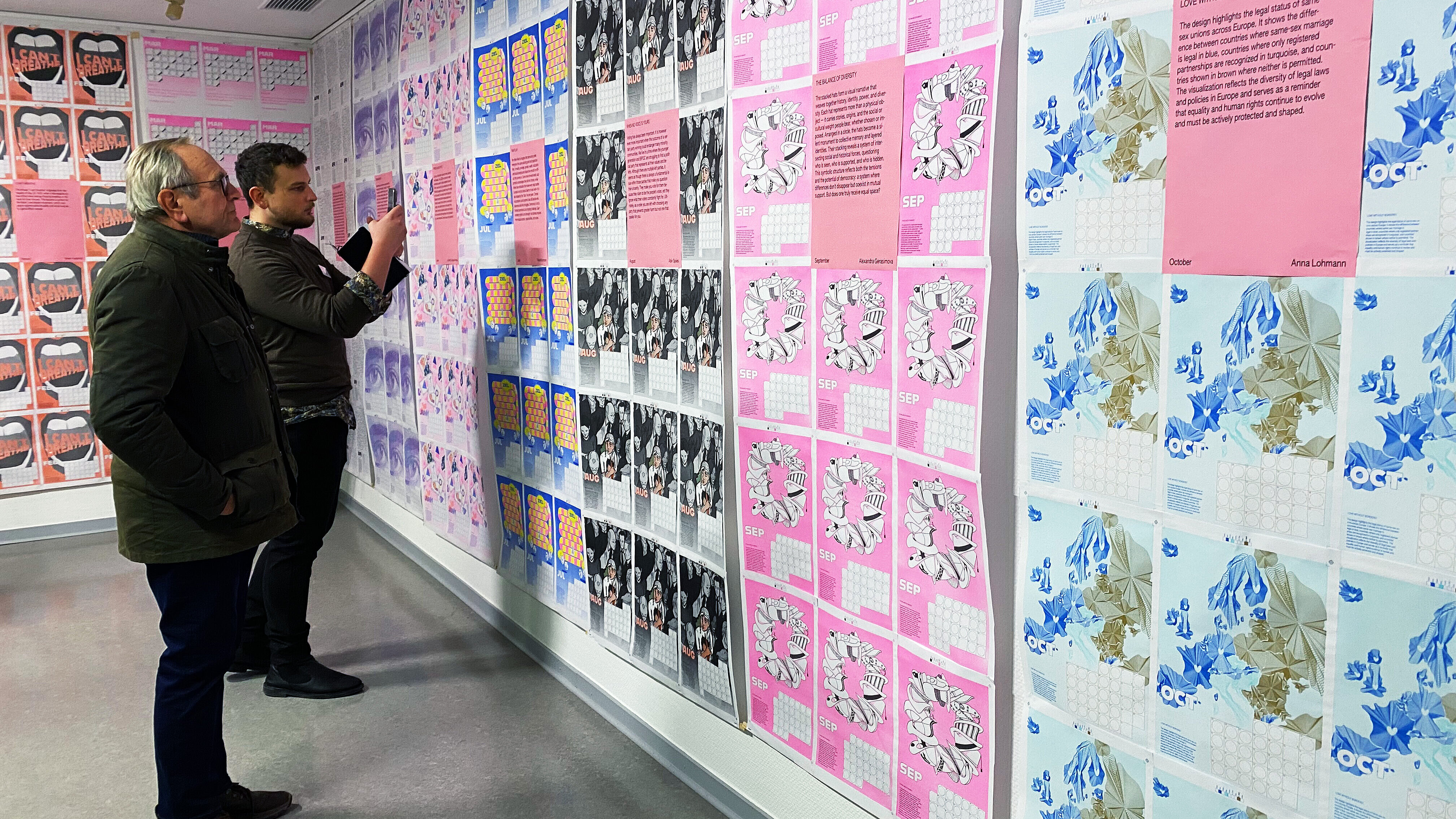 Am vergangenen Mittwoch stellten sie diesen gemeinsam bei der Eröffnung der Projektausstellung „Design for Democracy“ im Haus der Heimat in Wiesbaden vor und gaben persönliche Einblicke in die Konzeption der Motive sowie in die Produktion in der hochschuleigenen Risographenwerkstatt.