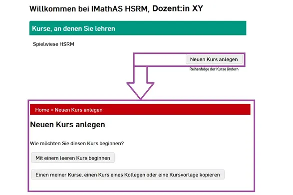 Nach dem Einloggen kommen Sie auf die Übersichtsseite, auf der im oberen Abschnitt Ihre als Dozent:in angelegten Kurse zu sehen sind.