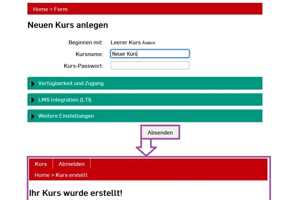 Nach Klick auf [Absenden] wird Ihnen die Kurserstellung bestätigt.
