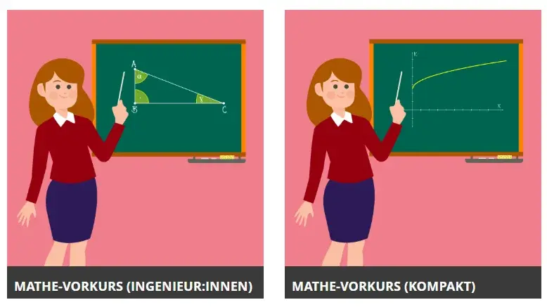 Zum eigenständigen Wiederholen der Mathematikgrundlagen aus der Schule gibt es einen kompakten Onlinekurs für alle Studierenden und einen etwas ausführlicheren Kurs für Studierende der Ingenieurwissenschaften.