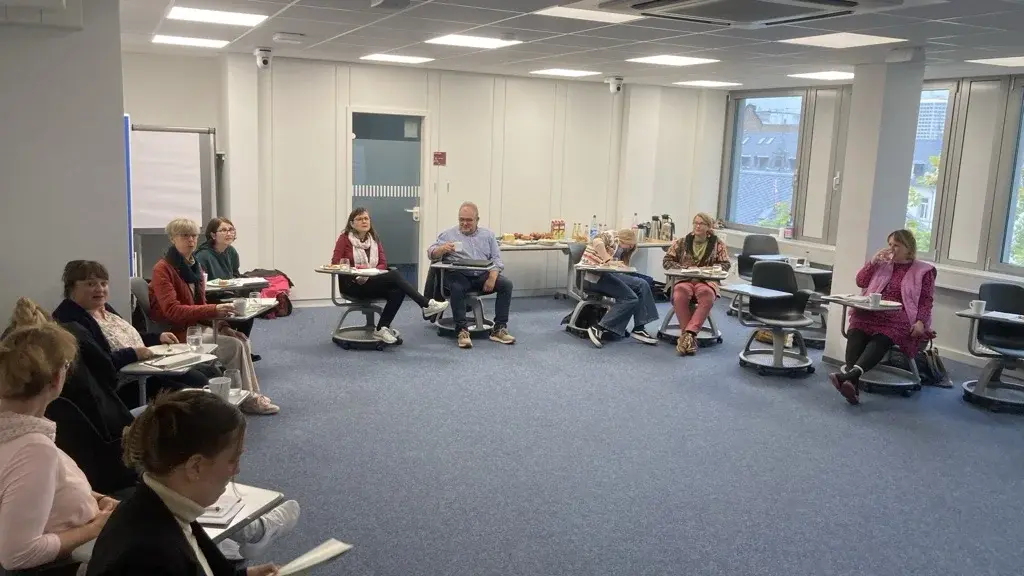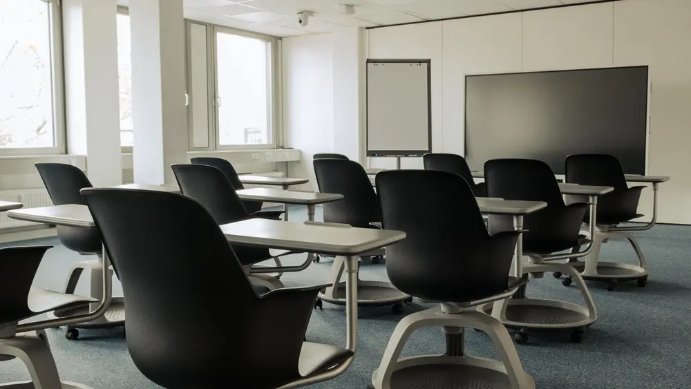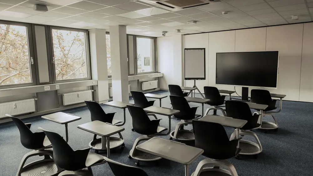 Der Seminarraum 2 ist speziell darauf ausgelegt, Interaktivität und lebendigen Austausch zu fördern. Statt klassischer Tischreihen stehen hier mobile Seminarstühle auf Rollen zur Verfügung, die flexible Sitzordnungen und spontane Gruppenarbeiten ermöglichen. Dadurch entsteht eine offene Lernatmosphäre, in der gemeinsames Arbeiten, Diskussionen und kreative Methoden im Mittelpunkt stehen.
